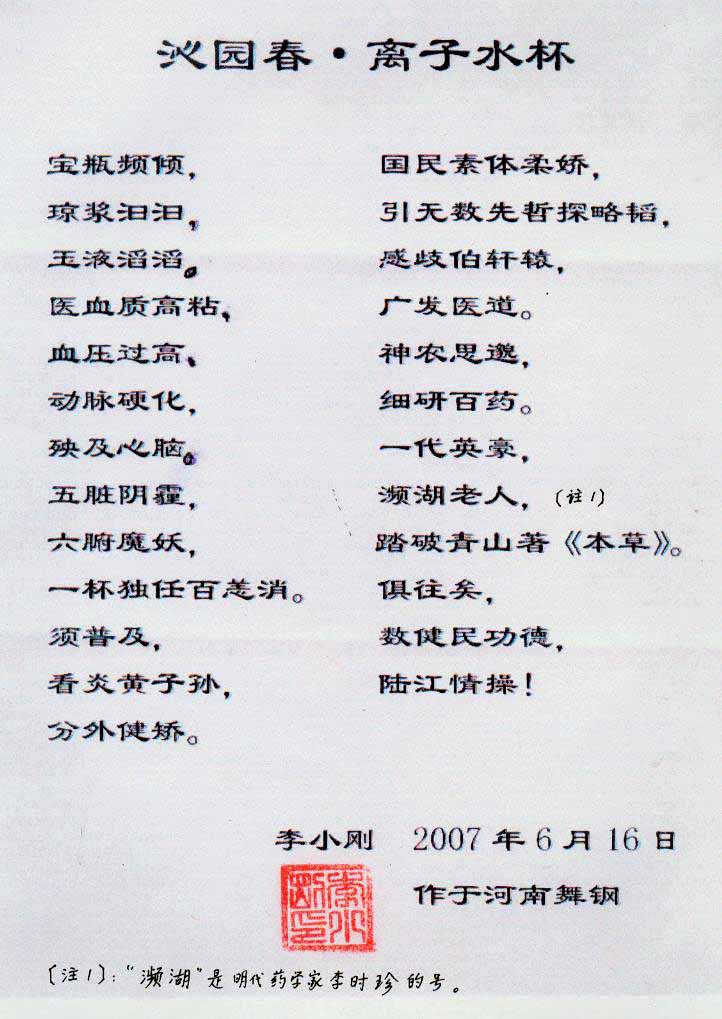 -----我是從事建筑的高工,本來(lái)沒(méi)有資格去攻克醫(yī)學(xué)難題,卻為了自身健康才扣響醫(yī)學(xué)的大門(mén)。由于我1990年患高血壓,因怕中風(fēng)才研究發(fā)明了離子水瓶,我把水處理成微小分子團(tuán)水,飲用后治愈了高血壓。便于1993年底送到三家省級(jí)醫(yī)院做臨床試用4個(gè)月。經(jīng)北京和廣西醫(yī)學(xué)專(zhuān)家鑒定:"降脂降壓效果好"," 能擴(kuò)大心腦動(dòng)脈流量,改善心腦電圖以及微循環(huán)","對(duì)治療心腦動(dòng)脈粥樣硬化、高血壓、高血脂有良好的醫(yī)療保健作用。""產(chǎn)品的技術(shù)性能和療效達(dá)到了同類(lèi)產(chǎn)品的國(guó)內(nèi)領(lǐng)先水平,經(jīng)廣西醫(yī)學(xué)科學(xué)情報(bào)研究所檢索,未見(jiàn)國(guó)外有類(lèi)似報(bào)道。"中國(guó)醫(yī)學(xué)科學(xué)院張正國(guó)教授從美國(guó)國(guó)立醫(yī)學(xué)圖書(shū)館數(shù)據(jù)庫(kù)存Medline檢索英俄文資料,均未見(jiàn)類(lèi)似報(bào)告。2000年上市后,我為了對(duì)消費(fèi)者負(fù)責(zé)而繼續(xù)觀察研究,一直通過(guò)《信譽(yù)卡》和《質(zhì)量跟蹤調(diào)查書(shū)》向患者承諾療效,請(qǐng)用戶使用6個(gè)月后反饋效果。和脂壓患者飲用2至5個(gè)月內(nèi),消除癥狀,停服藥物,血壓正常;冠心病患者飲用3~5個(gè)月逐漸減輕至消除心絞痛、房顫等癥狀,不再服藥,飲用1年左右心電圖正常,經(jīng)冠脈造影掃描無(wú)明顯狹窄,表明冠心病痊愈。大量患者還反映許多衰弱器官被修復(fù),讓前列腺增生、慢性咽喉炎、慢性氣管炎、支氣管炎、慢性胃炎、腸炎和膽囊炎等不藥而愈;2型糖尿病患者是因?yàn)橐葝u衰弱致病,飲用該水半年至一年,逐漸減藥至停藥,血糖尿糖正常,真正治愈2型糖尿病。中風(fēng)后遺癥患者飲用六七個(gè)月,可逐漸減輕至消除肢體和語(yǔ)言障礙,表明飲用該水能讓壽命很長(zhǎng)的神經(jīng)元細(xì)胞逐漸修復(fù),奇跡般地恢復(fù)肢體和語(yǔ)言功能。飲用后還使胸腺和脾臟兩個(gè)重要的免疫器官被修復(fù)和增強(qiáng),產(chǎn)生免疫細(xì)胞多,提高了免疫力,使人不生病或少生病。自此, 飲用微小分子團(tuán)水創(chuàng)造了攻克冠心病、高(低)血壓和糖尿病三大醫(yī)學(xué)難題的奇跡。人們對(duì)此感到不可思議,但實(shí)踐是檢驗(yàn)真理的唯一標(biāo)準(zhǔn)。